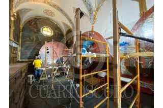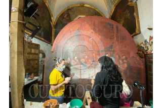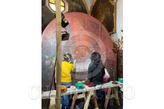 TEPOTZOTLÁN, ESTADO DE MÉXICO, 29NOVIEMBRE2021.- A mediados del siglo XVIII, el pintor novohispano Miguel Mateo Maldonado y Cabrera (1695–1768) recibió la encomienda por parte de las autoridades del Templo de San Francisco Javier, en el pueblo de Tepotzotlán, para crear una serie pictórica dentro de la sacristía del recinto jesuita, misma que estaría dedicada a ilustrar los pasajes asociados con el episodio evangélico de la Última Cena de Jesús de Nazaret. Pasados los siglos esa misma serie, integrada por 11 obras, es uno de los más destacados acervos del Museo Nacional del Virreinato (MNV), recinto del Instituto Nacional de Antropología e Historia (INAH) que lleva a cabo la conservación de cuatro de las citadas obras del conjunto. Bajo la supervisión del INAH, un grupo de especialistas, a cargo de la restauradora Marina Raquel Straulino Muñoz de Cote, atiende los deterioros de las obras tituladas: La institución del vino, La comunión de los apóstoles, El cenáculo y La eucaristía con las virtudes teologales, las cuales fueron elaboradas en una época en la que el artista era uno de los máximos exponentes de su época. Con trabajos iniciados en octubre y que alistan su conclusión hacia mediados de diciembre, en un primer momento el enfoque del proyecto era realizar la limpieza de las cuatro obras; sin embargo, se encontró que tres de ellas presentaban una intervención anterior que tuvo que continuarse y corregirse, mientras que la pintura La institución del vino no presentaba ninguna atención desde su creación. FOTO: INAH/CUARTOSCURO.COM
