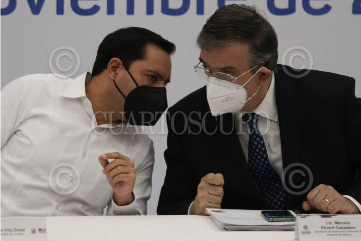 MÉRIDA, YUCATÁN, 30NOVIEMBRE2021.- En el Centro Internacional de Congresos de esta ciudad se llevó a cabo la clausura del "Segundo Encuentro de Gobernadores del Sureste y la Embajada de EUA" con la presentación de las Conclusiones Finales a cargo del Embajador de los Estados Unidos en México, Kenneth Lee Salazar, el Secretario de Relaciones Exteriores, Marcelo Ebrard Casaubon, el Gobernador de Yucatán, Mauricio Vila Dosal, la Gobernadora Layda Sansores de Campeche, y los Gobernadores Carlos Joaquín de Quintana Roo y Carlos Manuel Merino Campos de Tabasco. De igual manera se realizó la Firma de convenio entre el Gobierno del Estado de Yucatán y FedEx para el impulso a las MIPYMES yucatecas. FOTO: MARTÍN ZETINA/CUARTOSCURO.COM