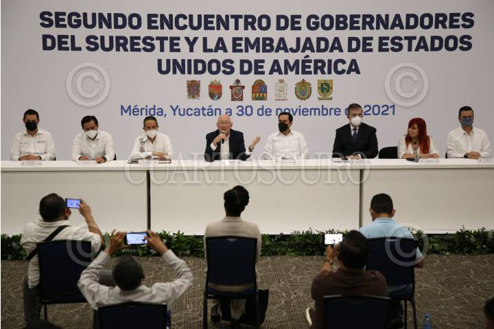 MÉRIDA, YUCATÁN, 30NOVIEMBRE2021.- En el Centro Internacional de Congresos de esta ciudad se llevó a cabo la clausura del "Segundo Encuentro de Gobernadores del Sureste y la Embajada de EUA" con la presentación de las Conclusiones Finales a cargo del Embajador de los Estados Unidos en México, Kenneth Lee Salazar, el Secretario de Relaciones Exteriores, Marcelo Ebrard Casaubon, el Gobernador de Yucatán, Mauricio Vila Dosal, la Gobernadora Layda Sansores de Campeche, y los Gobernadores Carlos Joaquín de Quintana Roo y Carlos Manuel Merino Campos de Tabasco. De igual manera se realizó la Firma de convenio entre el Gobierno del Estado de Yucatán y FedEx para el impulso a las MIPYMES yucatecas. FOTO: MARTÍN ZETINA/CUARTOSCURO.COM