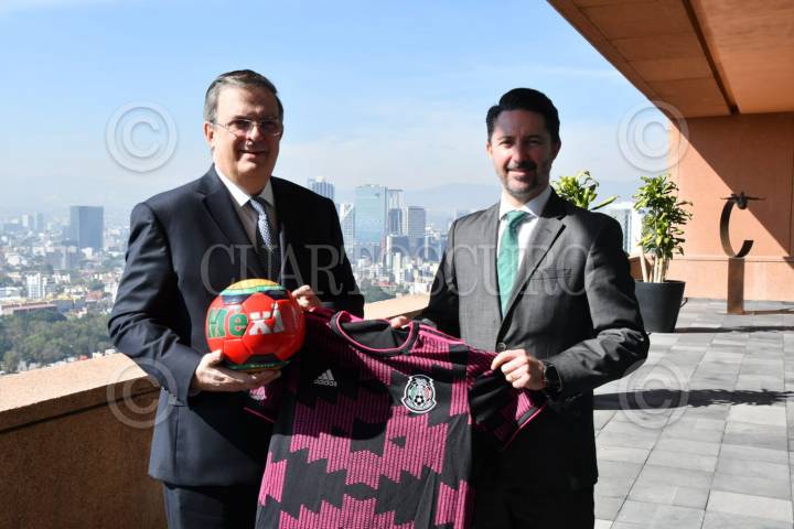 CIUDAD DE MÉXICO, 01DICIEMBRE2021.- El canciller Marcelo Ebrard Casaubon se reunió esta mañana con Yon de Luisa y autoridades de la Federación Mexicana de Futbol (Femexfut), a fin de trazar una hoja de ruta de acciones a emprender por el Gobierno de la República con la mira puesta a que México hospede de manera exitosa, y en conjunto con Estados Unidos y Canadá, el Mundial de Futbol de 2026. En coordinación con la FIFA y la Femexfut, el Gobierno de México se ha comprometido a otorgar las mejores garantías para la organización de la máxima justa del balompié con acciones en materia de comunicaciones, migración, seguridad, derechos humanos y protección a la propiedad industrial entre otros. FOTO: SRE/CUARTOSCURO.COM