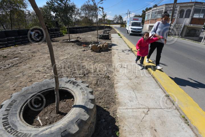 TOLUCA, ESTADO DE MÉXICO, 01DICIEMBRE2021.- Vecinos de San Pablo Autopán, delegación de Toluca, rehabilitaron un predio que era utilizado como tiradero de basura a un costado del Río Tejalpa, lo que es conocido como el puente de la Paz, con la visión de convertirlo en un lugar de recreación y reunión de las familias limpiaron el predio y dieron una nueva utilidad a neumáticos usados, con los cuales se construyó una pared y se encuentro sembrando árboles de distintas especies, este proyecto local llevará el nombre de “Parque recreativo y cultural de Paz”. FOTO: CRISANTA ESPINOSA AGUILAR /CUARTOSCURO.COM
