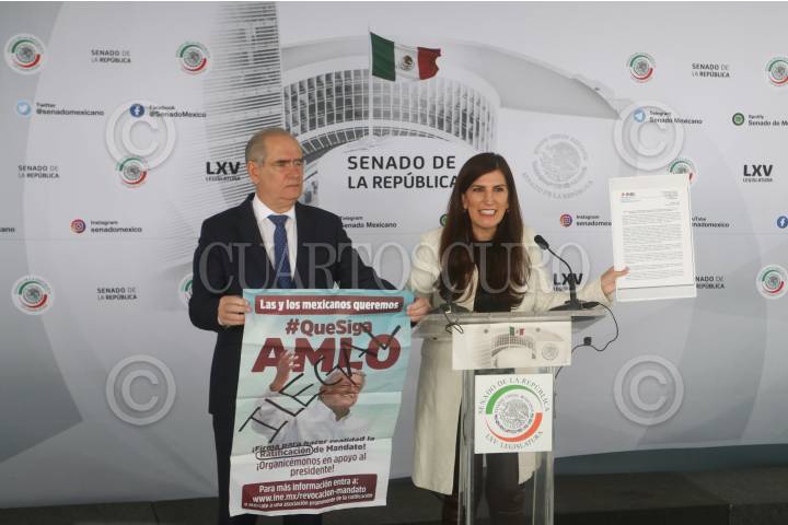 CIUDAD DE MÉXICO, 02DICIEMBRE2021.- Los senadores Julen Rementeria, Kenia López Rabadan y Damián Zepeda de la bancada del PAN, ofrecieron una conferencia de prensa en la que informaron que el INE aprobó que la propaganda para la revocación de mandato de Andrés Manuel López Obrador, presidente de México, sea quitada en las calles y redes sociales en 12 horas. El acto se realizó en el Patio del Federalismo. FOTO: GRACIELA LÓPEZ /CUARTOSCURO.COM