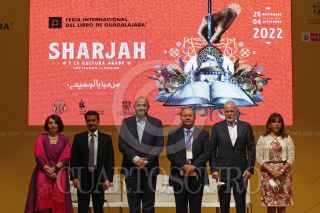 GUADALAJARA, JALISCO, 05DICIIEMBRE2021.- (De izq. a der.) La directora de la (FIL) Marisol Schulz, el presidente de la autoridad del libro de Sharjah, Ahmed Al-Ameri, el rector de la Universidad de Guadalajara Ricardo Villanueva, el embajador del Perú en México Manuel Gerardo Talavera, el presidente de la (FIL), Raúl Padilla y la consejera comercia de PromPerú en México María Teresa Villena, esto durante la ceremonia de clausura de la 35 edición de la Feria Internacional del Libro (FIL), que se lleva a cabo en Expo y en donde Perú es el país invitado de honor. FOTO: FERNANDO CARRANZA GARCIA / CUARTOSCURO.COM