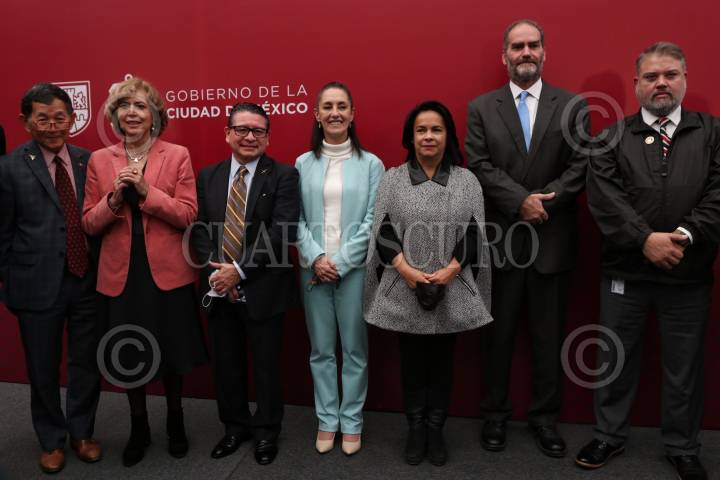 CIUDAD DE MÉXICO, 07DICIEMBRE2021. - Claudia Sheinbaum Pardo, jefa de Gobierno de la Ciudad acompañada de Tomás Sibaja, presidente Cluster Aeroespacial de Baja California y Margarita Saldaña, alcaldesa de Azcapotzalco durante visita de negocios de empresarios del clúster aeroespacial de Baja California a Vallejo-i. FOTO: ANDREA MURCIA /CUARTOSCURO.COM