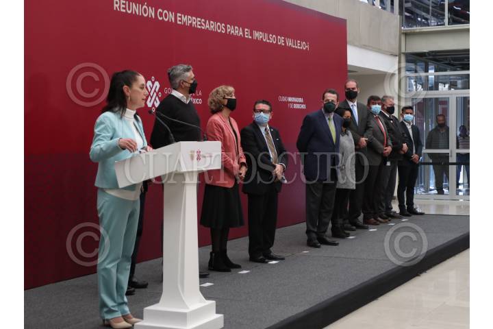 CIUDAD DE MÉXICO, 07DICIEMBRE2021. - Claudia Sheinbaum Pardo, jefa de Gobierno de la Ciudad acompañada de Tomás Sibaja, presidente Cluster Aeroespacial de Baja California y Margarita Saldaña, alcaldesa de Azcapotzalco durante visita de negocios de empresarios del clúster aeroespacial de Baja California a Vallejo-i. FOTO: ANDREA MURCIA /CUARTOSCURO.COM