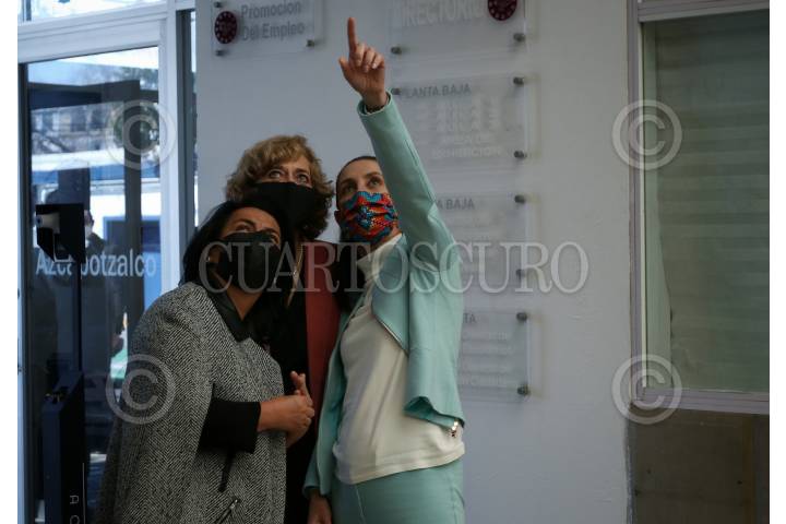 CIUDAD DE MÉXICO, 07DICIEMBRE2021. - Claudia Sheinbaum Pardo, jefa de Gobierno de la Ciudad acompañada de Tomás Sibaja, presidente Cluster Aeroespacial de Baja California y Margarita Saldaña, alcaldesa de Azcapotzalco durante visita de negocios de empresarios del clúster aeroespacial de Baja California a Vallejo-i. FOTO: ANDREA MURCIA /CUARTOSCURO.COM