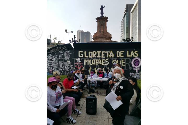 CIUDAD DE MÉXICO, 07DICIEMBRE2021.- Madres que buscan a sus hijos e hijas desaparecidas o que cuyas hijas han sido víctimas de feminicidio dieron una conferencia de prensa en la Glorieta de las Mujeres, antes Glorieta a Colón, llamaron a la Jefa de Gobierno a respetar la intervención artística-social de la cual ha sido objeto este monumento, ya que es una manera de recordarle a la sociedad que hay muchas personas que a diario desaparecen o asesinan a 10 mujeres al día en México. La activistas señalaron que hace unos días lograron detener un operativo en el que la policía estaba retirando las vallas metálicas, en las cuales están los nombres de víctimas de la violencia que se vive en el país. FOTO: MOISÉS PABLO/CUARTOSCURO.COM