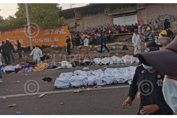 TUXTLA GUTIÉRREZ, CHIAPAS, 09DICIEMBRE2021.- Un tráiler que transportaba en su caja migrantes de manera ilegal se quedó sin frenos volcando en la carretera Chiapa de Corzo, a la altura de la colonia El Refugio. Autoridades estatales han confirmado 49 muertes y al menos 50 heridos, tres de ellos de gravedad. FOTO: CUARTOSCURO.COM