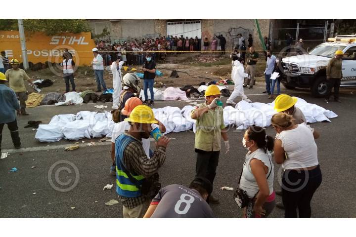 TUXTLA GUTIÉRREZ, CHIAPAS, 09DICIEMBRE2021.- Un tráiler que transportaba en su caja migrantes de manera ilegal se quedó sin frenos volcando en la carretera Chiapa de Corzo, a la altura de la colonia El Refugio. Autoridades estatales han confirmado 49 muertes y al menos 50 heridos, tres de ellos de gravedad. FOTO: CUARTOSCURO.COM