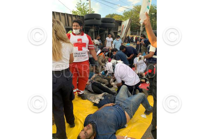 TUXTLA GUTIÉRREZ, CHIAPAS, 09DICIEMBRE2021.- Un tráiler que transportaba en su caja migrantes de manera ilegal se quedó sin frenos volcando en la carretera Chiapa de Corzo, a la altura de la colonia El Refugio. Autoridades estatales han confirmado 49 muertes y al menos 50 heridos, tres de ellos de gravedad. FOTO: CUARTOSCURO.COM