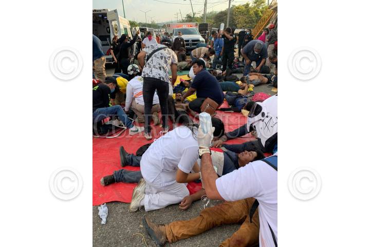 TUXTLA GUTIÉRREZ, CHIAPAS, 09DICIEMBRE2021.- Un tráiler que transportaba en su caja migrantes de manera ilegal se quedó sin frenos volcando en la carretera Chiapa de Corzo, a la altura de la colonia El Refugio. Autoridades estatales han confirmado 49 muertes y al menos 50 heridos, tres de ellos de gravedad. FOTO: CUARTOSCURO.COM