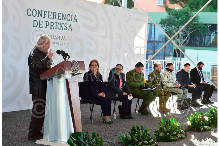 CHIHUAHUA, CHIHUAHUA, 10DICIEMBRE2021.- Andrés Manuel López Obrador, Presidente Constitucional de los Estados Unidos Mexicanos, ofreció su prensa matutina desde Chihuahua. Lo acompañaron María Eugenia Campos, gobernadora constitucional de Chihuahua; Rosa Icela Rodríguez Velázquez, Secretaria de Seguridad y Protección Ciudadana; Luis Cresencio Sandoval, secretario de la Defensa Nacional; José Rafael Ojeda Durán, secretario de Marina; Luis Rodríguez Bucio, Comandante de la Guardia Nacional; Ricardo Mejia Bermeja, subsecretario de Seguridad Pública y Marco Antonio Bonilla, presidente municipal de Chihuahua. FOTO: PRESIDENCIA/CUARTOSCURO.COM