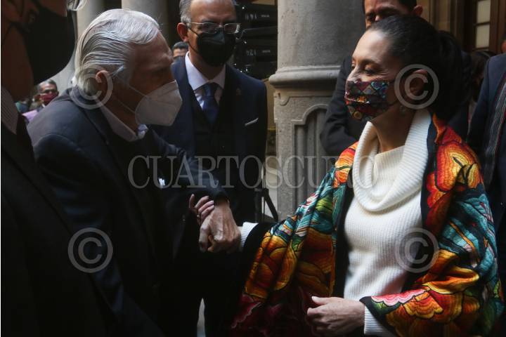 CIUDAD DE MÉXICO, 10DICIEMBRE2021.- Claudia Sheinbaum, jefa de Gobierno; José Carlos Acosta Ruíz, alcalde de Xochimilco; Loredana López Montes López, directora General del Fideicomiso del Centro Histórico, y Fréderic Vacheron Oriol, representante de la oficina de la UNESCO en México, encabezaron el 34 Aniversario de la Declaratoria del Centro Histórico de la Ciudad de México y Xochimilco como Patrimonio Cultural de la Humanidad. FOTO: GRACIELA LÓPEZ /CUARTOSCURO.COM
