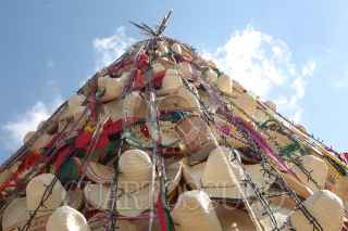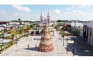 NACAJUCA, TABASCO, 12DICIEMBRE2021.- Un enorme pino navideño artesanal de la cultura Biji Yocot´an, con imágenes de sombreros, flautas, máscaras, tambores, bolsas, abanicos, escobas y tiras; que fue elaborado por artesanos chontales con materiales regionales como guano, cañitas y joloche entre los que destacan fibras de henequén y petetate fue colocado en el parque central Miguel Hidalgo y Costilla. De igual manera a unos metros, y cerca de la parroquia de San Antonio de Paua, está un nacimiento representativo del nacimiento del Niño Dios. FOTO: CARLOS CABAL OBRADOR/CUARTOSCURO.COM
