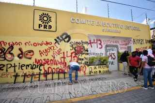 CHILPANCINGO, GUERRERO, 12DICIEMBRE2021.- A golpe de marro, barretas y cincel, estudiantes de la Normal Rural de Ayotzinapa ingresaron al edificio que ocupa la sede del Comité Ejecutivo Estatal (CEE) del PRD, donde realizaron destrozos en ventanales, muebles y material de oficina, a diez años de desalojo en que murieron sus compañeros Alexis Herrera Pino y Gabriel Echeverría de Jesús. Si Ramón Almonte Borja es electo como titular de la Fiscalía General del Estado (FGE), el Congreso Local estaría lanzando “la primera piedra de provocación”, advirtió Francisco Echeverría de Jesús, durante un mitin para conmemorar el décimo aniversario luctuoso de su hermano, Gabriel, y Jorge Alexis Herrera Pino. Este domingo, se cumplió una década de los hechos ocurridos en la Autopista del Sol, en el punto conocido como ‘El Parador del Marques’ al sur de la capital del estado, por lo que familiares, integrantes de los colectivos ‘Los Olvidados de Ayotzinapa’ y ‘Padres y Madres de los 43’, acompañados por estudiantes de la Escuela Normal Rural ‘Raúl Isidro Burgos’ de Ayotzinapa, organizaciones y luchadores sociales, junto con estudiantes de las normales rurales que integran la Federación de Estudiantes Campesinos Socialistas de México (FECSM), marcharon por las calles de la capital para exigir justicia y castigo a los actores que perpetraron estos hechos. FOTO: DASSAEV TÉLLEZ ADAME/CUARTOSCURO.COM