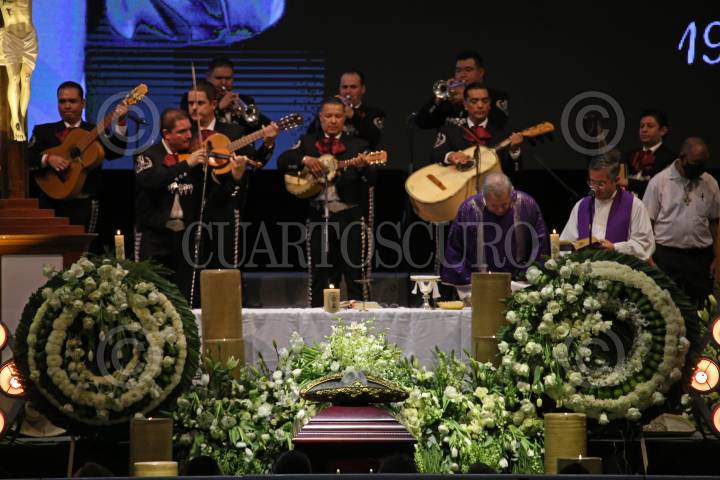 GUADALAJARA, JALISCO, 13DICIEMBRE2021.- Esta tarde en la Arena VFG ubicada a un costado del Rancho Los Tres Potrillos y en compañía de familiares, amigos y admiradores, se llevo a cavo la misa de cuerpo presente para despedir los restos de “El Charro de Huentitán” Vicente Fernández Gómez, quien falleció por problemas de salud la madrugada del pasado domingo, en un conocido Hospital de la ciudad. FOTO: FERNANDO CARRANZA GARCIA / CUARTOSCURO.COM