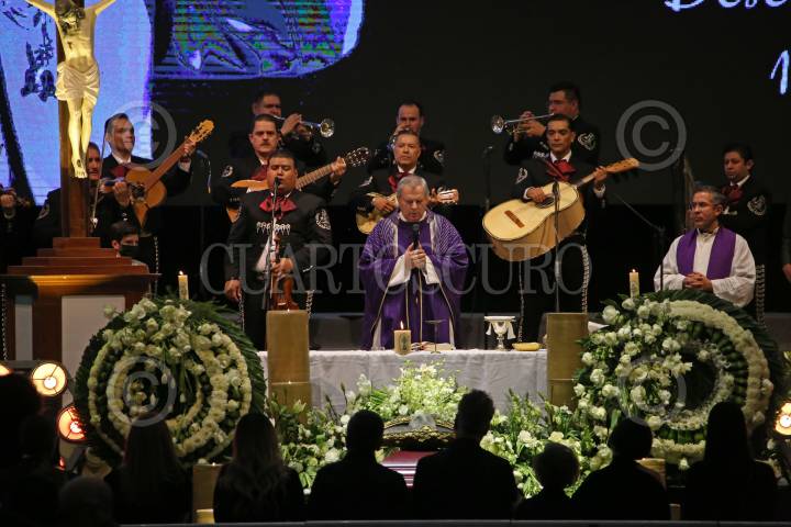 GUADALAJARA, JALISCO, 13DICIEMBRE2021.- Esta tarde en la Arena VFG ubicada a un costado del Rancho Los Tres Potrillos y en compañía de familiares, amigos y admiradores, se llevo a cavo la misa de cuerpo presente para despedir los restos de “El Charro de Huentitán” Vicente Fernández Gómez, quien falleció por problemas de salud la madrugada del pasado domingo, en un conocido Hospital de la ciudad. FOTO: FERNANDO CARRANZA GARCIA / CUARTOSCURO.COM