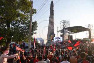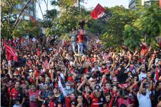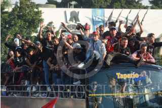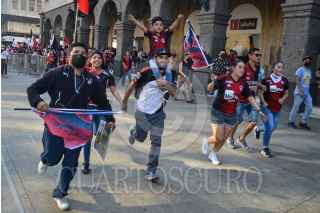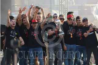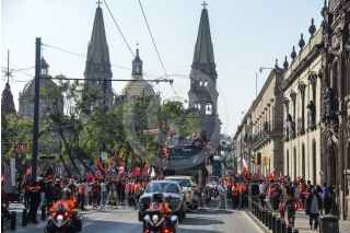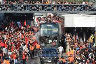 GUADALAJARA, JALISCO, 13DICIEMBRE2021.- Jugadores del Atlas realizaron un recorrido en el primer cuadro de la ciudad para celebrar junto sus aficionados el campeonato obtenido luego de 70 años sin lograrlo. El recorrido se realizó de la Catedral Metropolitana a la Glorieta de los Niños Héroes. FOTO: MARIO JASSO/CUARTOSCURO.COM