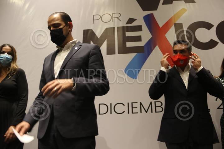 CIUDAD DE MÉXICO. 14DICIEMBRE2021.- Dirigentes de los traa partidos integrantes de la Alianza Va X México; Marko Cortés del PAN, del PRI Alejandro Moreno, y del PRD Jesús Zambrano, hablaron ante medios de información en un conocido hotel del Centro de la Capital Mexicana. FOTO: VICTORIA VALTIERRA/CUARTOSCURO.COM