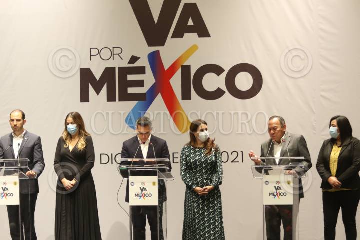 CIUDAD DE MÉXICO. 14DICIEMBRE2021.- Dirigentes de los traa partidos integrantes de la Alianza Va X México; Marko Cortés del PAN, del PRI Alejandro Moreno, y del PRD Jesús Zambrano, hablaron ante medios de información en un conocido hotel del Centro de la Capital Mexicana. FOTO: VICTORIA VALTIERRA/CUARTOSCURO.COM