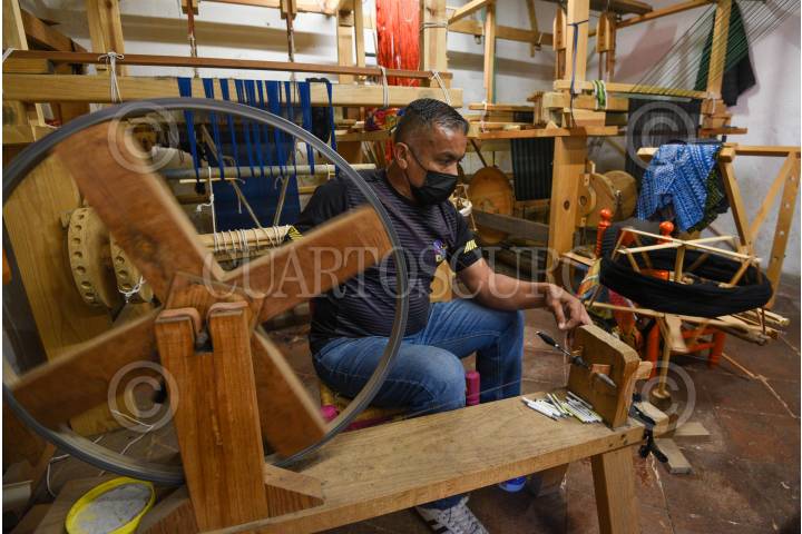 CALIMAYA, ESTADO DE MÉXICO, 14DICIEMBRE2021.- La Rebocería es un colectivo de más de 30 artesanos de rebozo de Calimaya y Tenancingo, buscan rescatar la tradición del rebozo a través de diversas ideas como cubrebocas, ropa, joyería, zapatos, monederos, y en estas fechas están produciendo esferas navideñas, en donde usan el lienzo del rebozo, y con una esfera de unicel van uniendo los gajos de cada lienzo, durante esta temporada han sido muy solicitadas, las venden por docena y media docena, y son en su mayoría por pedidos a través de sus redes sociales @lareboceria, una nueva forma de adornar los hogares mexicanos con mucha tradición. FOTO: CRISANTA ESPINOSA AGUILAR /CUARTOSCURO.COM