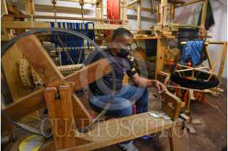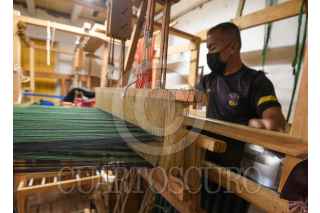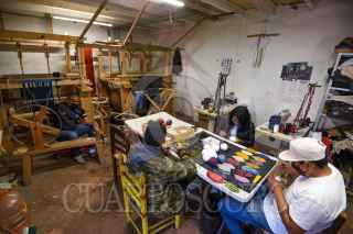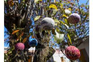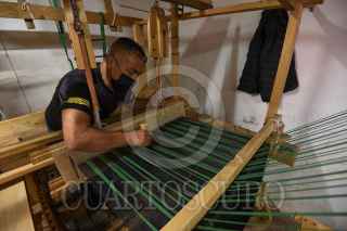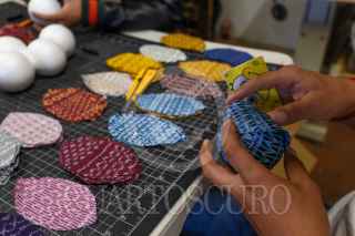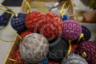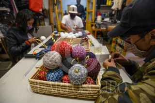 CALIMAYA, ESTADO DE MÉXICO, 14DICIEMBRE2021.- La Rebocería es un colectivo de más de 30 artesanos de rebozo de Calimaya y Tenancingo, buscan rescatar la tradición del rebozo a través de diversas ideas como cubrebocas, ropa, joyería, zapatos, monederos, y en estas fechas están produciendo esferas navideñas, en donde usan el lienzo del rebozo, y con una esfera de unicel van uniendo los gajos de cada lienzo, durante esta temporada han sido muy solicitadas, las venden por docena y media docena, y son en su mayoría por pedidos a través de sus redes sociales @lareboceria, una nueva forma de adornar los hogares mexicanos con mucha tradición. FOTO: CRISANTA ESPINOSA AGUILAR /CUARTOSCURO.COM
