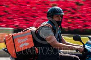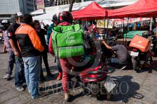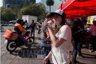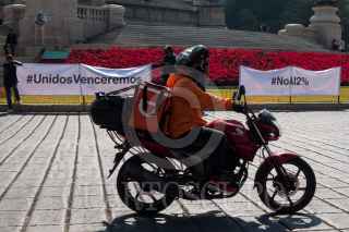 CIUDAD DE MÉXICO, 16DICIEMBRE2021.- Integrantes del Sindicato de Conductores de Vehículos de Servicios (Siconvese) y la asociación NiUnrepartidorMenos instalaron un taller sobre la lateral de la glorieta del Ángel de la Independencia para dar servicio gratis a motocicletas y bicicletas de las y los empleados de aplicaciones de mensajería. El acto se realiza como protesta ante el anuncio de un impuesto del 2% a las apps de este giro. Dicho impuesto entrará en vigor a partir de enero 2022. FOTO: GALO CAÑAS/CUARTOSCURO.COM