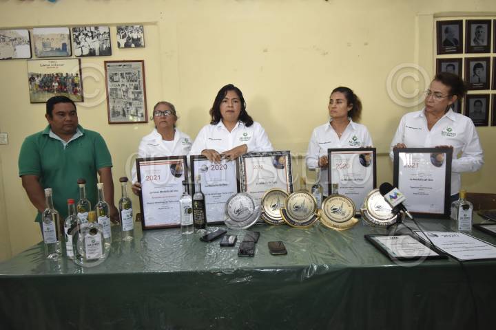 CHILPANCINGO, GUERRERO, 16DICIEMBRE2021.- Mujeres ganadoras de medallas de plata, oro y gran oro (también nombrado doble oro) por mezcal de calidad, hicieron un llamado al gobierno estatal para que se puedan certificar las marcas que representan, ya que es lo único que les falta para poder exportar este elixir ancestral a otros países, donde ya comienza a ser conocido por los logros que han obtenido. Este jueves las integrantes de esta Asociación encabezadas por su presidenta, Beatriz Valenzo Campos ofrecieron una conferencia de prensa donde dio a conocer que iniciaron a trabajar en el 2019 y que actualmente están trabajando con productores de Chilpancingo, Mochitlan, Tixtla, Mártir de Cuilapan, Eduardo Neri y Acapulco. Valenzo Campos sostuvo que en Guerrero “hay un excelente Mezcal artesanal, estamos certificando nuestros procesos para mejorar la calidad y poder tener mercado donde podamos colocar nuestros productos; el llamado que hacemos a la gobernadora, Evelyn Salgado Pineda y al presidente, Andrés Manuel López Obrador a que nos acompañen, que no nos dejen solos, que nos ayuden con subsidios a la producción y comercialización, que sean solidarios, porque en nuestro caminar de 3 años hemos estado completamente solos, calidad hay, queremos que nos acompañen”. FOTO: DASAEV TELLEZ ADAME /CUARTOSCURO.COM