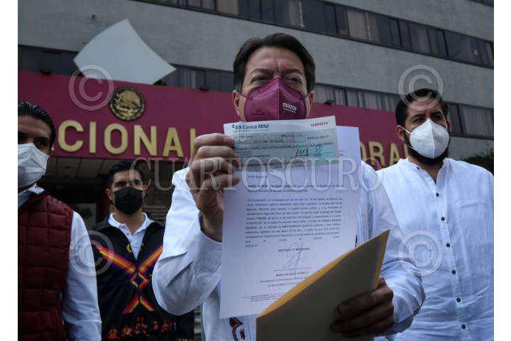 CIUDAD DE MÉXICO, 19DICIEMBRE2021.- Mario Delgado, presidente del partido político MORENA ofreció conferencia se prensa luego de entregar un cheque de $547, 726, 006.25 en el Ine supuestamente para vacunas contra COVID-19. FOTO: ANDREA MURCIA /CUARTOSCURO.COM