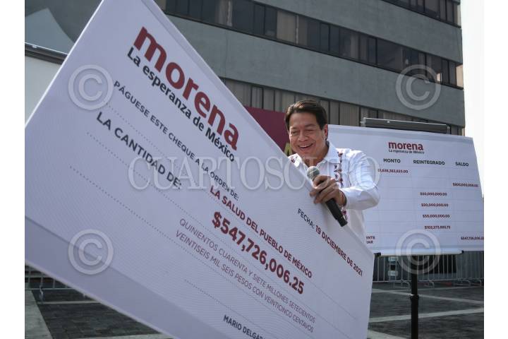 CIUDAD DE MÉXICO, 19DICIEMBRE2021.- Mario Delgado, presidente del partido político MORENA ofreció conferencia se prensa luego de entregar un cheque de $547, 726, 006.25 en el Ine supuestamente para vacunas contra COVID-19. FOTO: ANDREA MURCIA /CUARTOSCURO.COM