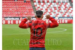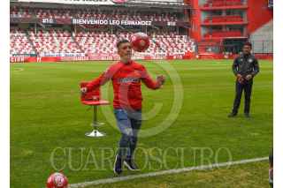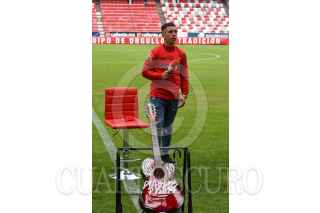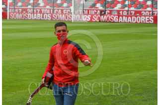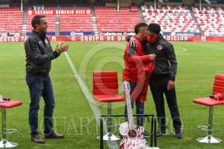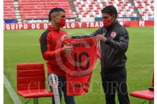 TOLUCA, ESTADO DE MÉXICO, 19DICIEMBRE2021.- El Deportivo Toluca Fútbol Club presentó a su nuevo refuerzo, el mediocampista uruguayo Leo Fernández, quien regresó al Infierno con el numero 10, recibió de manos de Antonio Naelson Sinha, presidente del deportivo y Francisco Suinaga, presidente del club. FOTO: CRISANTA ESPINOSA AGUILAR /CUARTOSCURO.COM