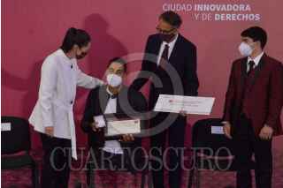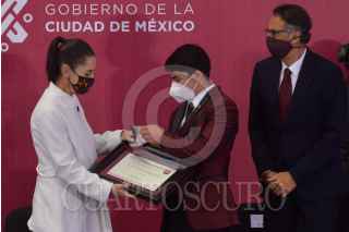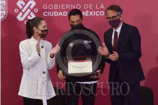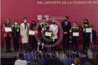 CIUDAD DE MÉXICO, 22DICIEMBRE2021.- Claudia Sheinbaum Pardo, jefa de Gobierno, en compañía de Javier Ariel Hidalgo Ponce, director general del INDEPORTE y Ana Gabriela Guevara, directora general de CONADE, encabezó la ceremonia de premiación a lo mejor del deporte de la Ciudad de México 2021, donde se destaca la entrega del galardón del Premio Estatal del Deporte 2021, y reconocimientos a ganadores de los Juegos Nacionales y Paranacionales CONADE. FOTO: MARIO JASSO/CUARTOSCURO.COM