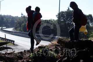 HUITZILAC, MORELOS, 22DICIEMBRE2021. Una madre joven camina cargando un bebe en su espalda, seguida de su hijo mayor, cerca del paradero de comida de Coajomulco, muy cerca de la autopista ala CDMX. FOTO: MARGARITO PÉREZ RETANA / CUARTOSCURO.COM