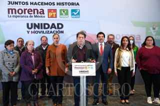 CIUDAD DE MÉXICO, 22DICIEMBRE2021.- El presidente nacional de Morena, Mario Delgado Carrillo, en compañía de la Comisión Nacional de Elecciones, la Comisión Nacional de Encuestas y los representantes de las dirigencias nacionales del Partido del Trabajo (PT), el Partido Verde Ecologista de México (PVEM) y Nueva Alianza, informó que José Ramón Enríquez, Gonzalo Yáñez y Marina Vitela son los perfiles mejor posicionados en las encuestas realizadas en el estado de Durango. FOTO: ESPECIAL/CUARTOSCURO.COM