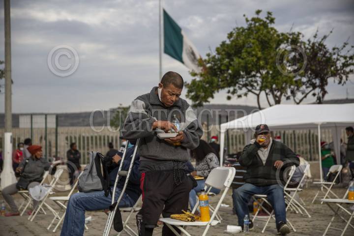 TIJUANA, BAJA CALIFORNIA, 22DICIEMBRE2021.- Con motivo de las festividades decembrinas esta tarde fue realizada una posada para migrantes y personas en situación de calle en la plaza ubicada a un costado de bomberos en la zona centro, asociaciones civiles de ambos lados de la frontera y la delegación del centro fueron los encargados de organizar la actividad. Los asistentes recibieron cobijas, ropa , bufandas y alimentos, en su mayoría era migrantes haitianos, y familias. Para amenizar la ocasión y entretener a los niños asistió Santa Claus y el Grinch. FOTO: OMAR MARTÍNEZ /CUARTOSCURO.COM