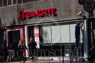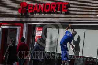 CIUDAD DE MÉXICO, 28DICIEMBRE2021.- Un trabjador de intendencia limpia los vidrios de la fachada de una sucursal de Banorte. FOTO: MOISÉS PABLO/CUARTOSCURO.COM