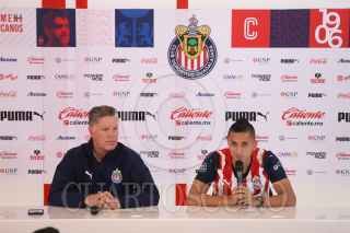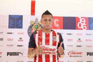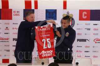 GUADALAJARA, JALISCO, 28DICIEMBRE2021.- Roberto "Piojo" Alvarado fue presentado como nuevo jugador de las Chivas de Guadalajara, el ex celeste portará la playera con el número 25. Ricardo Peláez, director deportivo del Rebaño acompaño al joven en su presentación. FOTO: CUARTOSCURO.COM