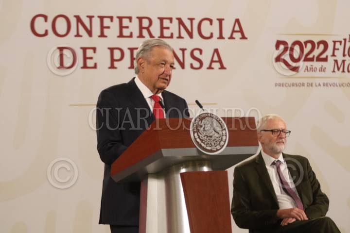 CIUDAD DE MÉXICO, 03ENERO2022.- Andrés Manuel López Obrador, Presidente de México, durante la primera mañanera del año en Palacio Nacional. Lo acompañaron Ricardo Sheffield Padilla, titular de Profeco; Rosa Icela Rodríguez, secretaria de Seguridad y Protección Ciudadana; Jeremy Corbyn, miembro del parlamento Británico y ex líder del Partido Laborista, y su esposa Laura Álvarez, acompañante (esposa). FOTO: MOISÉS PABLO/CUARTOSCURO.COM
