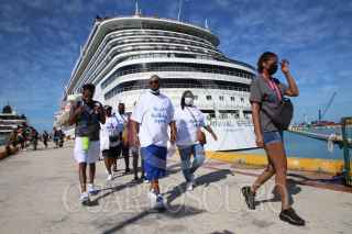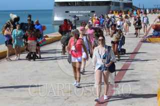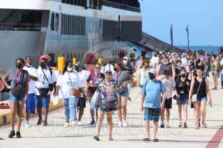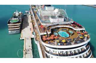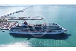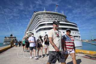 PROGRESO, YUCATÁN, 06ENERO2022.- El crucero World Voyager atracó hoy en el puerto de Progreso, junto con el Carnival Breeze. De acuerdo con datos de la Secretaría de Fomento Turístico en el estado, SEFOTUR, en el año 2019, antes de la declaración de la pandemia, se registró la llegada de 146 arribos, 470 mil 418 pasajeros y una inyección de 18.8 millones de dólares. Por lo que este año se espera el arribo de 108 cruceros programados. FOTO: MARTÍN ZETINA/CUARTOSCURO.COM