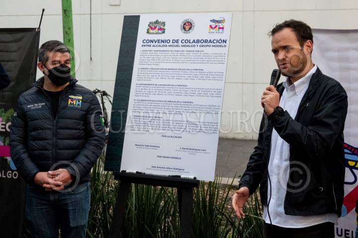 CIUDAD DE MÉXICO, 08ENERO2022.- Mauricio Tabe, alcalde de Miguel Hidalgo, y José Antonio Alfaro Díaz, director de Asuntos Corporativos de Grupo Modelo, encabezaron la firma de convenio entre la demarcación y la empresa cervecera para el cuidado y mejoramiento del Parque Lineal Ferrocarril de Cuernavaca. En el acto también estuvo presente la diputada panista Margarita Zavala. FOTO: GALO CAÑAS/CUARTOSCURO.COM