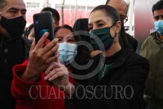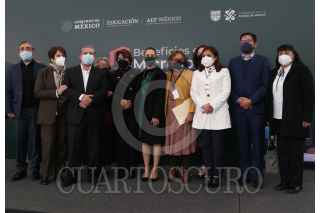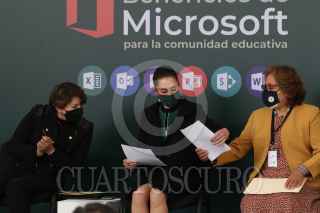 CIUDAD DE MÉXICO, 10ENERO2022. - Claudia Sheinbaum Pardo, jefa de Gobierno de la Ciudad acompañada de Delfina Gómez Álvarez, secretaria de la educación en la Ciudad; Luis humberto Fernández fuentes titular de la autoridad educativa en la Ciudad y Ariel Pacheca, representante de Microsoft durante la presentación de los Beneficios de las Herramientas Digitales Microsoft para la Comunidad Educativa de la Ciudad de México. El evento se llevó a cabo en la Escuela Secundaria Diurna 66 “Ida Appendini Dagasso. FOTO: ANDREA MURCIA /CUARTOSCURO.COM