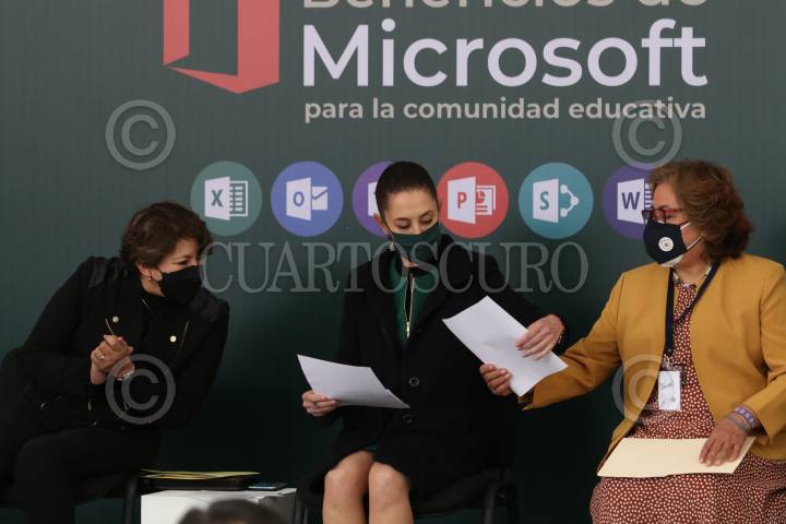 CIUDAD DE MÉXICO, 10ENERO2022. - Claudia Sheinbaum Pardo, jefa de Gobierno de la Ciudad acompañada de Delfina Gómez Álvarez, secretaria de la educación en la Ciudad; Luis humberto Fernández fuentes titular de la autoridad educativa en la Ciudad y Ariel Pacheca, representante de Microsoft durante la presentación de los Beneficios de las Herramientas Digitales Microsoft para la Comunidad Educativa de la Ciudad de México. El evento se llevó a cabo en la Escuela Secundaria Diurna 66 “Ida Appendini Dagasso. FOTO: ANDREA MURCIA /CUARTOSCURO.COM