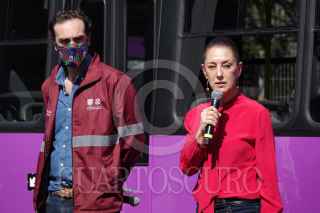 CIUDAD DE MÉXICO, 15ENERO2022.- La jefa de gobierno de la Ciudad de México Claudia Sheinbaum en compañía de Andrés Lajous, secretario de Moviidad, puso en marcha las 65 nuevas unidades de transporte que sustituyen a 174 microbuses chafarrinados en el corredor Legaría, alcaldía Miguel Hidalgo. Sheinbaum Pardo destacó que las unidades son autobuses cortos que podrán accesar sin problemas en las calles de la demarcación y que aceptarán el pago con la tarjeta de movilidad integrada. FOTO: GALO CAÑAS/CUARTOSCURO.COM