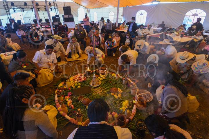 TOLUCA, ESTADO DE MÉXICO, 17ENERO2021.- Pobladores de la zona indígena Otomí de Toluca buscan rescatar y preservar sus usos y costumbres así como sean reconocidas por diversas instancias, tal es el caso de las bodas tradicionales indígenas, realizan una ceremonia en donde la pareja es recibida por sus familiares y autoridades tradicionales para realizar el enlace, estos son purificados con un sahumerio, collares y coronas de flores les son colocados al igual que a sus familiares , el lugar en donde se lleva a cabo la ceremonia es instalada una altar que lleva flores, fruta, licores, pan; pidiendo permiso a los cuatro elementos, tierra, aire, fuego y agua ofrecen tres canastas a los novios que tienen algunas hierbas medicinales, fruta y pan, chocolate, licores, que significan salud, abundancia y unión para este nuevo matrimonio. La ceremonia es llevada por un guía y son amarrados con un rebozo y un gabán para realizar la unión, les es colocado un lazo de flores, el intercambio del molcajete y el ayate es uno de los últimos pasos de esta ceremonia, la cual concluye con la firma y entrega de su acta expedida por las autoridades tradicionales y la cual tiene valor. FOTO: CRISANTA ESPINOSA AGUILAR /CUARTOSCURO.COM