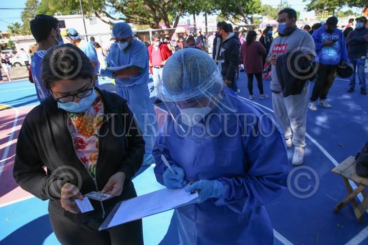 MÉRIDA, YUCATÁN, 19ENERO2022.- Ante el creciente número de contagios por Covid 19 personal de la Secretaría de Salud de Yucatán (SSY) realiza 100 pruebas gratuitas de antígenos todos los días en espacios públicos. El día de hoy se pudo observar desde muy temprana hora las largas filas de personas que acudieron a la cancha de la Colonia Fidel Velasquez con el fin de realizarse la prueba de antígenos para detectar o descartar el virus. De acuerdo al último informe de la Secretaría de Salud en el Estado (SSY) en tan sólo 24 horas se reportaron 712 nuevos contagios de Coronavirus. En total son ya 6,523 las personas fallecidas a causa del Covid 19 desde que empezó la contingencia y se tiene confirmado que 72,376 pacientes ya se recuperaron: no presentan síntomas ni pueden contagiar. Esta cifra representa el 86% del total de contagios registrados, que es 84,636 hasta el último reporte. Actualmente son 110 pacientes en hospitales públicos. FOTOS MARTÍN ZETINA /CUARTOSCURO.COM
