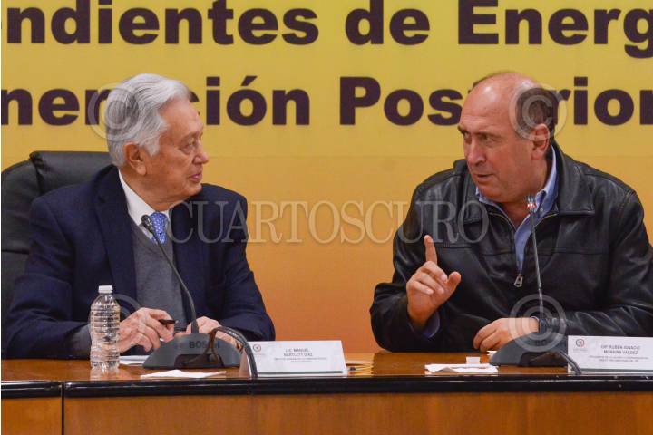 CIUDAD DE MÉXICO, 19ENERO2022.- Manuel Bartlett, director general del la CFE; José Abugaber, presidente de la CONCAMIN; Ricardo Mota Palomino, director general CENACE; Ignacio Mier, diputado y coordinador de Morena, y Rubén Moreira, diputado y presidente de la Jucopo, encabezaron el Segundo Foro: Redes Eléctricas como parte del debate de la Reforma Eléctrica. FOTO: MARIO JASSO/CUARTOSCURO.COM