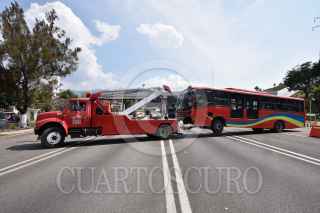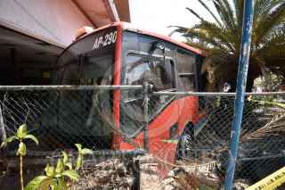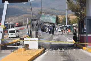 CHILPANCINGO, GUERRERO, 20ENERO2022.- Un camión del transporte público de la línea Acabus fue robado en el puerto de Acapulco y tras una persecución fue estrellado en la caseta de peaje en Palo Blanco, sobre la Autopista del Sol, en el municipio de Chilpancingo. El hecho ocurrió alrededor de las 10 de la mañana y de acuerdo con la información de las autoridades, el solitario sujeto robó el camión con un arma de fuego en el municipio de Acapulco, cerca de La Venta; fue hasta la caseta de Palo Blanco donde el sujeto con el camión derribó otra cabina de peaje y terminó estrellándose contra una tienda de autoservicio, bajó de la unidad e intentó darse a la fuga, pero fue detenido por la Policías Estatales que ya lo esperaban en ese lugar. FOTO: DASSAÉV TÉLLEZ /CUARTOSCURO.COM