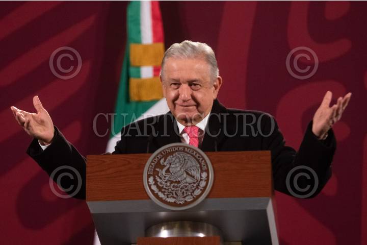 CIUDAD DE MÉXICO, 24ENERO2022.- Andrés Manuel López Obrador, Presidente de México, durante la mañanera en Palacio Nacional, en donde recibió a los primeros candidatos a dirigir el Sindicato de Trabajadores Petroleros de la República Mexicana: Ricardo Aldana Prieto, Victoria Arredondo Lami, Daniel Aranda Padilla, María Cristina Alonso García, y José Luis Cabrera Raga. También estuvo presente Ricardo Sheffield Padilla, director de Profeco. FOTO: MOISÉS PABLO/CUARTOSCURO.COM