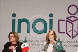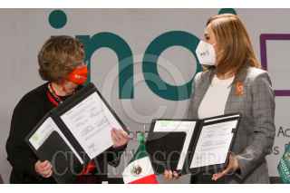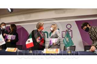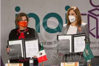 CIUDAD DE MÉXICO. 25ENERO2022.- Nadine Gasman, de INMUJERES y Blanca Lilia Ibarra del INAI, en la firma de convenio de éstas dos instituciones para proteger datos de mujeres. FOTO: VICTORIA VALTIERRA/CUARTOSCURO.COM