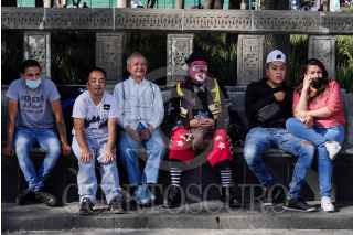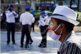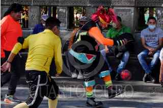 CIUDAD DE MÉXICO, 25ENERO2022.- Payasos urbanos del Centro Histórico protestaron con una “cascarita” de fútbol en el costado del Palacio de Bellas Artes para poder laborar después de la presunta detención de uno de sus compañeros por las autoridades. FOTO: GALO CAÑAS/CUARTOSCURO.COM